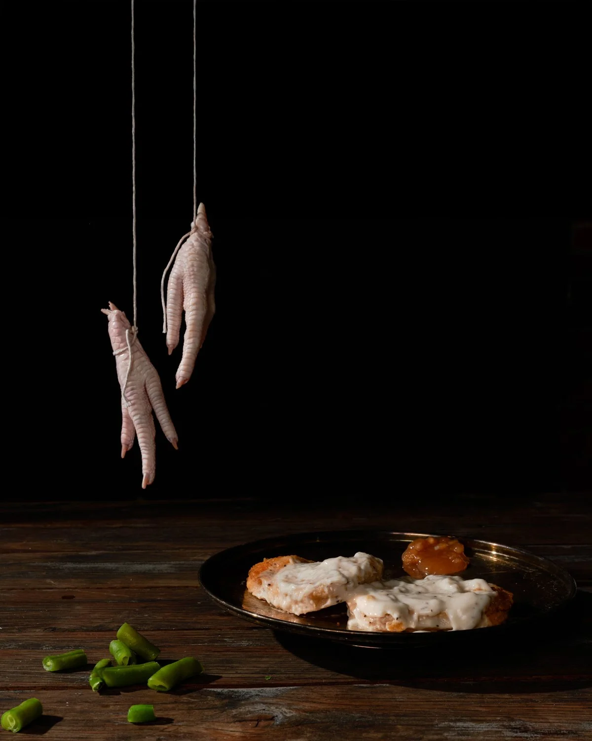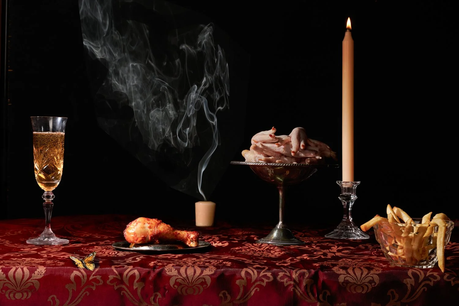 I draw inspiration from their baroque lighting and use of chiaroscuro and populate the photos with meticulously chosen items, such as animal parts like pig’s feet or chicken legs, along with fast or processed foods that are derived from the same animal part.